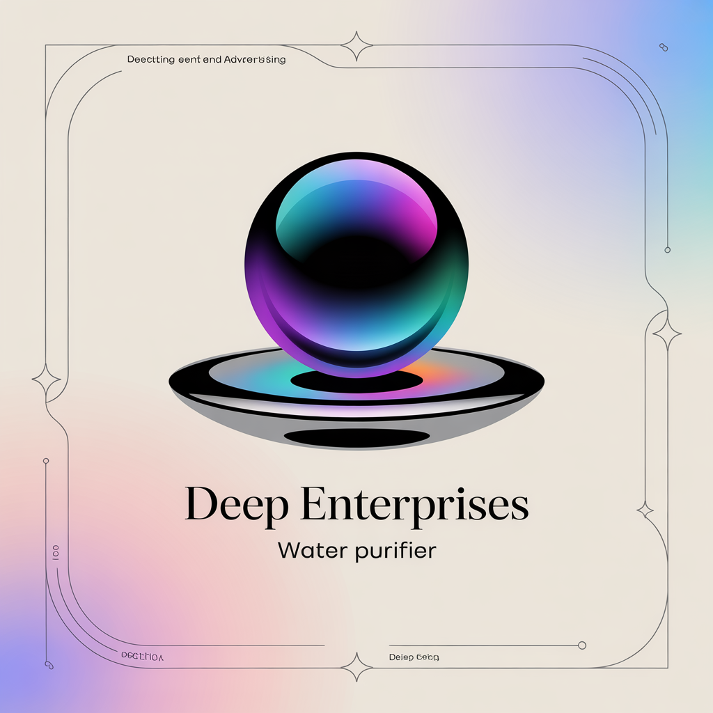 Introducing a visually striking 2D logo for 'DEEP ENTERPRISES', crafted to reflect sophistication and modernity in the Marketing and Advertising industry. This logo features a sleek, refined formal script for the company name and the slogan 'Water Purifier', set against a premium UI background. With a full-color approach and original design elements, this logo aims to captivate customers and enhance brand recognition.